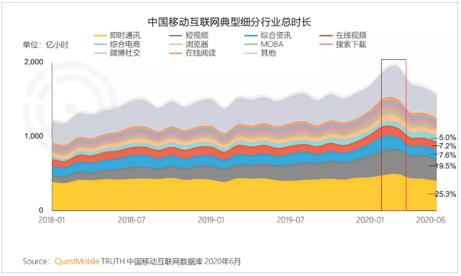 “長視頻活躍用戶量同比下跌,6月份已經降至8.57億,相比之下,短視頻持續快速增長,已經到了8.52億。”QuestMobile發布的報告中稱,短視頻在收割用戶的同時,還在收割巨頭的時間,截止到2020年6月,短視頻的消費時間,已經占據全網用戶時長的19.5%,相比之下,此前占比近50%的即時通訊,已經下跌至25.3%。