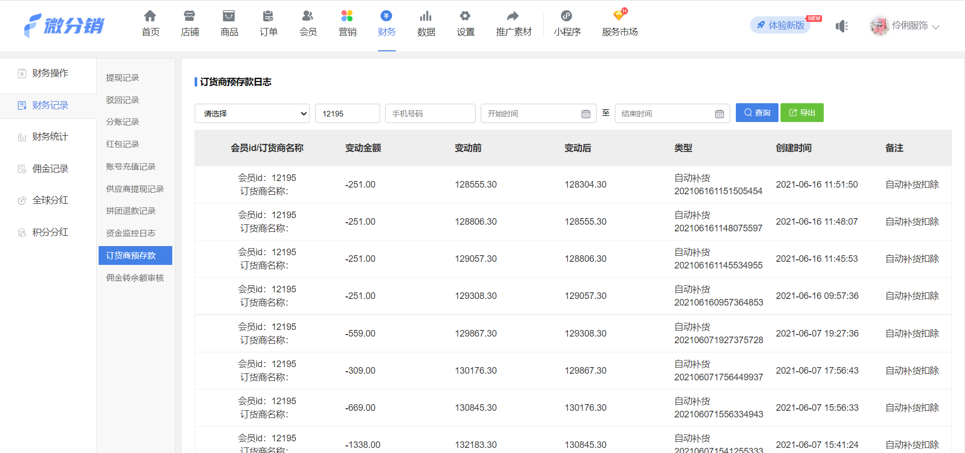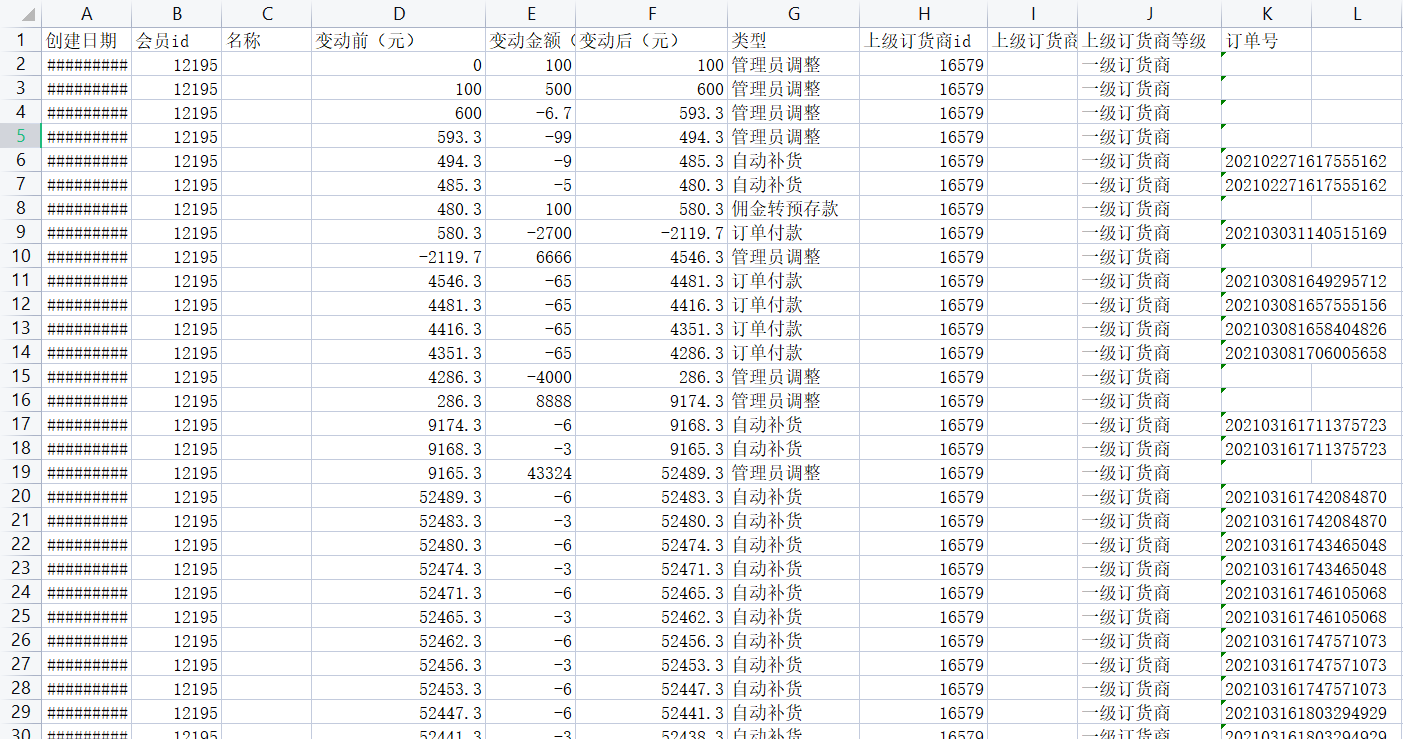 現(xiàn)邏輯:財務-財務記錄-訂貨商預存款,導出表格增加“變動前”和“變動后”的字段和對應的數(shù)據(jù);