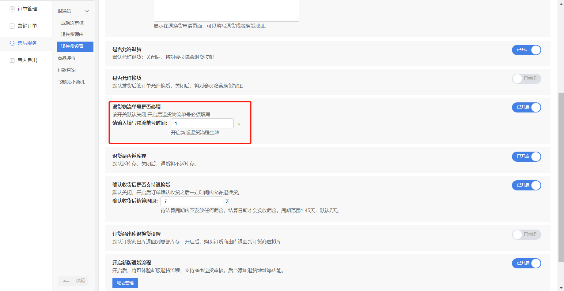 現(xiàn)邏輯:通過管理后臺-售后服務-退換貨設(shè)置-請輸入填寫物流單號時間設(shè)置填寫退貨單號的時間,請輸入1~60之間的整數(shù)。買家超期未填寫系統(tǒng)會自動拒絕退貨申請。此功能需要開啟新版退貨流程生效。
