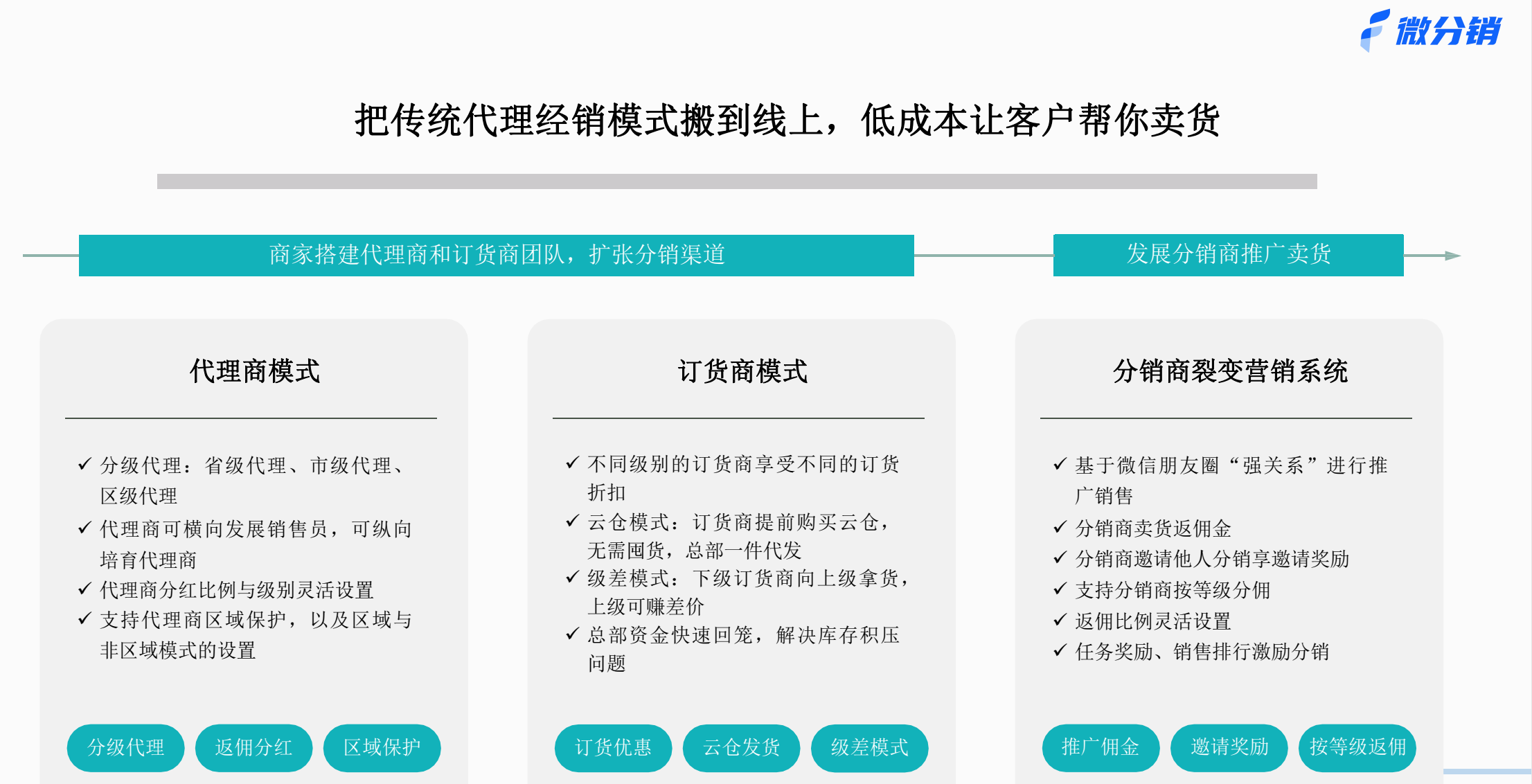 微分銷商城帶有分銷體系,經(jīng)典二級分銷,打造超強分銷戰(zhàn)隊、裂變式分銷賣貨,分銷裂變鎖粉、供應商入駐、招代理商、內(nèi)置百余種營銷功能,微信小程序開店、營銷、管理一鍵搞定,助力商家招募更多分銷商幫忙賣貨,零成本就可以把客戶轉(zhuǎn)變?yōu)榉咒N商、代理商,突破招商難的渠道瓶頸。