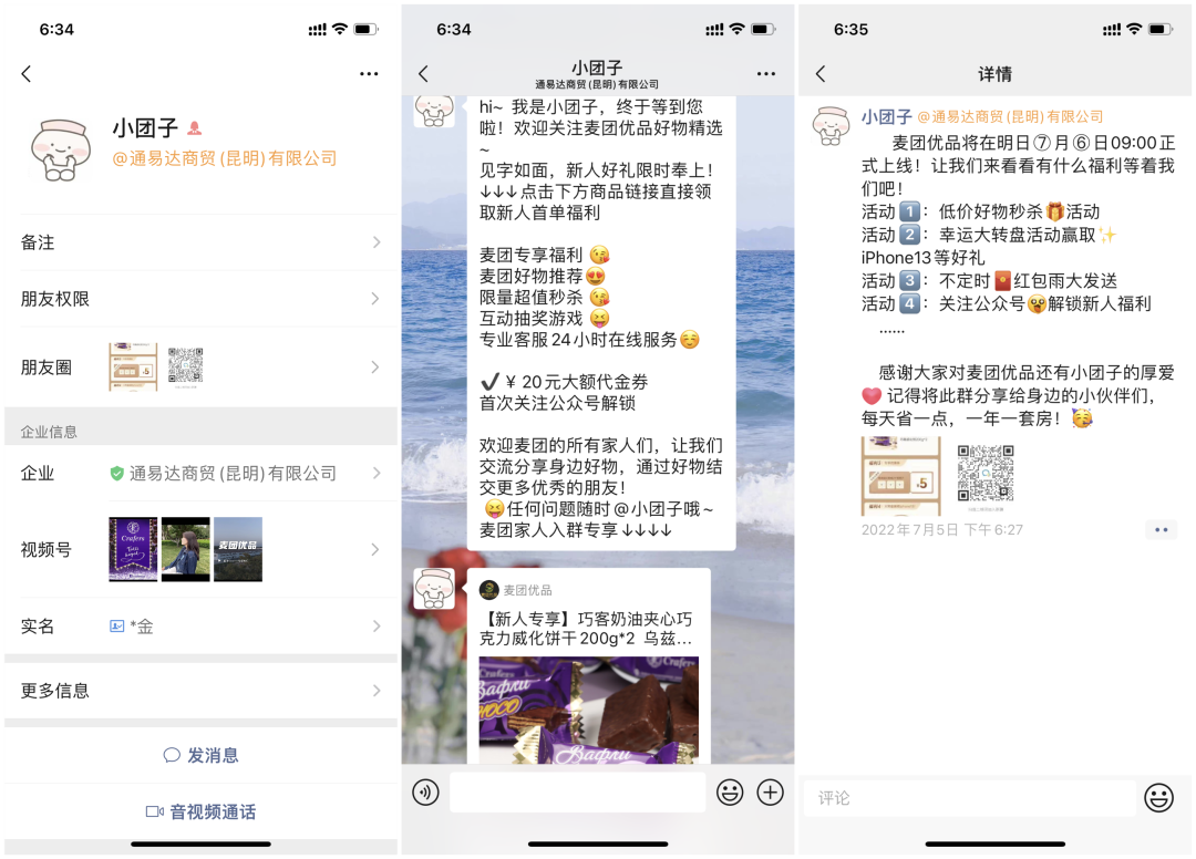 麥團優品根據各平臺特性,在微信公眾號、視頻號、商城小程序等多個線上渠道,設置導流“鉤子”即“新人專享福利”,吸引用戶添加企業微信號。