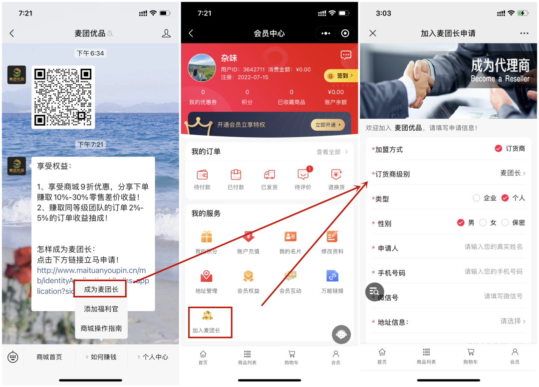 麥團優品致力于給每一個用戶提供優質的產品、合理的價格、至尊的售后服務,不僅打造一個優質的社交電商平臺,更是一個在分享的過程中,傳遞溫暖結交朋友,線上招募分銷商和代理商,讓大家擁有共同的事業,彼此共同成長,完美打造業務與用戶體驗的閉環,用戶可以自購省錢,分享賺錢,實現分銷裂變式拓客,為社群和小程序持續帶來流量和訂單復購。