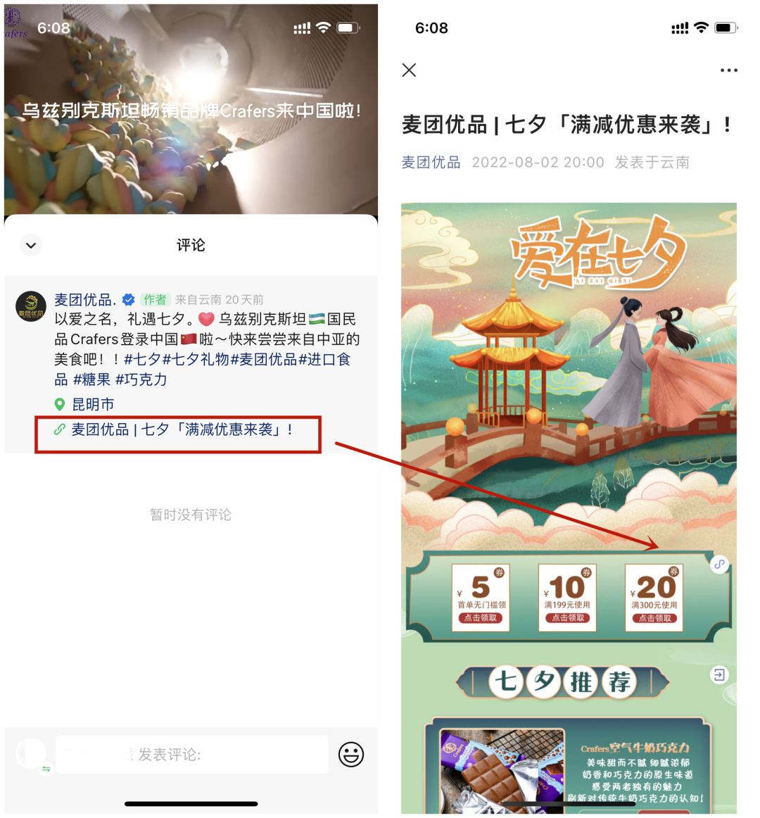 視頻號宣傳內容為直播相關的主題宣傳片,和麥團直播上的直播主題進行同步聯動,比如最近的七夕節日營銷活動,點進視頻詳情頁中可以直達公眾號文章,即可獲取相關福利,主要的消費以及會員活動都集成在小程序中轉化完成。