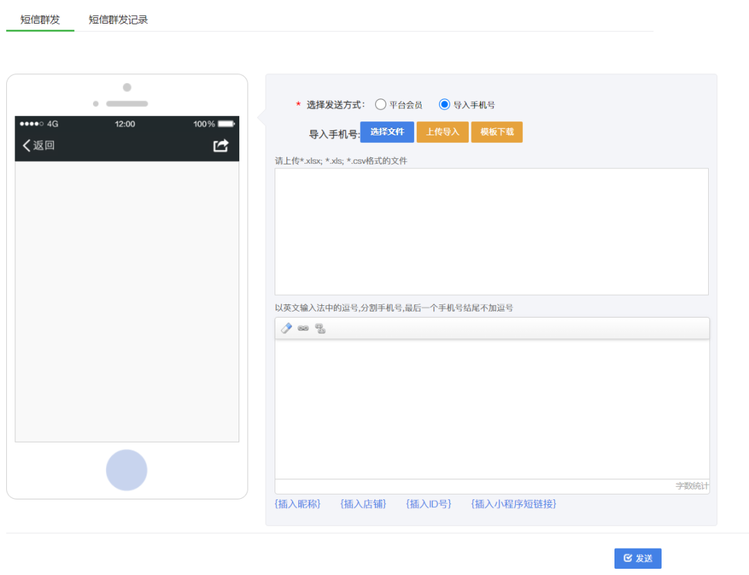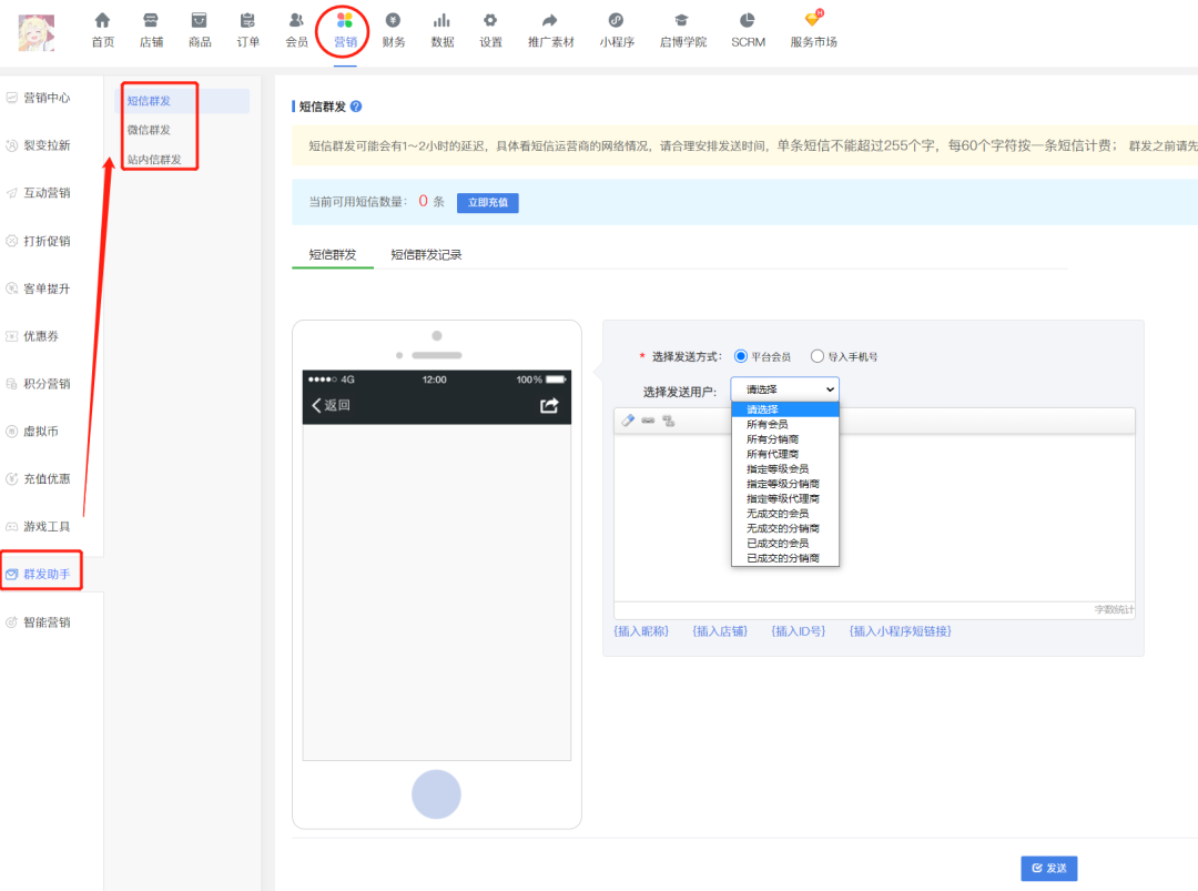 ① 短信群發(fā):以短信的形式發(fā)給商城內(nèi)的會員、分銷商、代理商、訂貨商等用戶,也可以導(dǎo)入手機(jī)號到平臺內(nèi),將短信發(fā)送給這批自定義用戶;