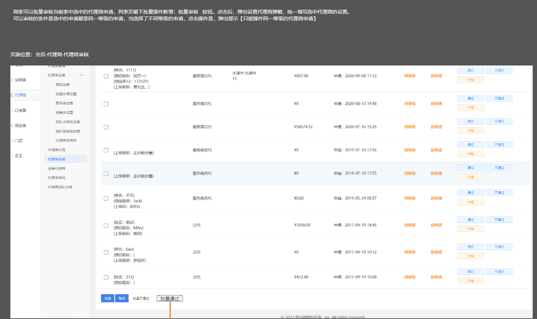 功能描述:商家可以批量審核當前表中選中的代理商申請,列表頁最下批量操作新增【批量審核】按鈕,點擊后,彈出設置代理商彈窗,統一填寫選中代理商的設置??梢詫徍说臈l件是選中的申請都是同一等級的申請,當選擇了不同等級的申請,點擊操作是,彈窗提示【只能操作同一等級的代理商申請】。