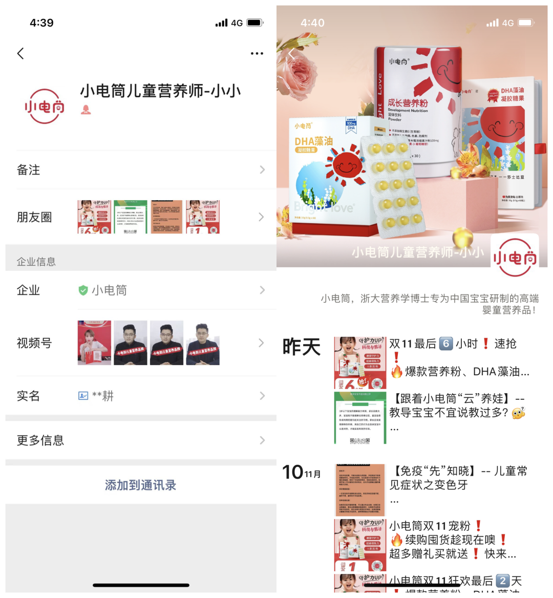 點擊視頻號的添加微信,會添加到一個叫小電筒兒童營養師-小小企微人設;