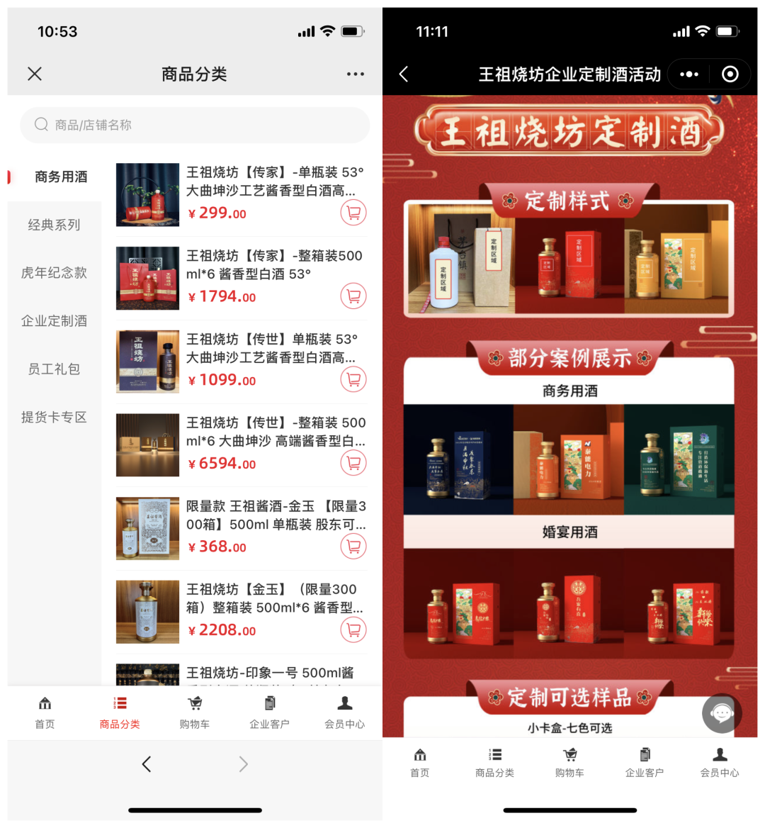 王祖燒坊通過線上商城實(shí)現(xiàn)與新消費(fèi)人群和場景的打通,在商品分類中,品牌通過設(shè)置商務(wù)用酒、經(jīng)典系列、虎年紀(jì)念款、企業(yè)定制酒、員工禮包、提貨卡專區(qū)分類,貼心地幫助用戶快速選擇適合的酒品,持續(xù)挖掘用戶消費(fèi)意愿。