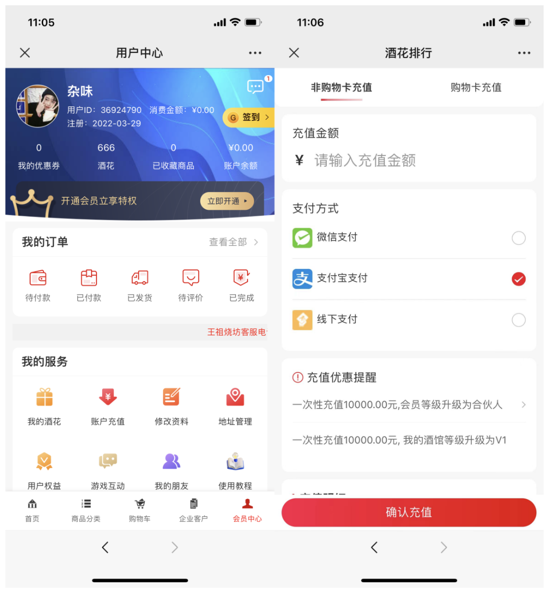 王祖燒坊合作啟博微分銷,同時(shí)部署了小程序商城和h5微商城,商品、會員、訂單等數(shù)據(jù)互通,商城分布統(tǒng)一都是“首頁”、“商品分類”、“購物車”、“企業(yè)客戶”、“會員中心”五大模塊構(gòu)成。