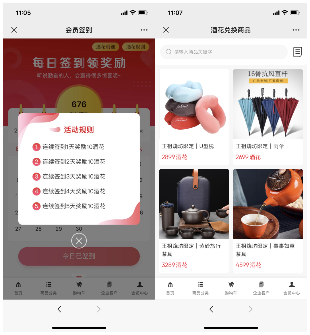 在白酒商品之外,王祖燒坊把低客單、復(fù)購高的生活用品:如U型枕、雨傘等引入到線上商城,再通過上線簽到打卡、蘿卜精靈游戲、下單贈酒花(積分)等營銷玩法,提升客戶的進(jìn)店頻次,同時(shí)酒花(積分)還能兌換該類商品。