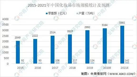 根據(jù)國(guó)家統(tǒng)計(jì)局?jǐn)?shù)據(jù)顯示,2015年-2019年期間,我國(guó)限額以上化妝品類(lèi)零售總體保持增長(zhǎng)趨勢(shì),2019年限額以上化妝品行業(yè)零售總額為2,992億元,產(chǎn)量達(dá)124萬(wàn)噸。預(yù)計(jì)在2021年我國(guó)化妝品零售總額和產(chǎn)量分別可達(dá)3392億元和142萬(wàn)噸。