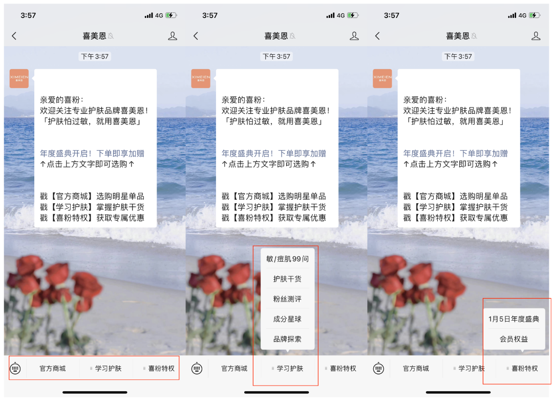 關(guān)注「喜美恩」公眾號(hào)后,在自動(dòng)歡迎語(yǔ)中引導(dǎo)用戶(hù)點(diǎn)擊菜單欄“官方商城”選購(gòu)下單、“學(xué)習(xí)護(hù)膚”掌握護(hù)膚干貨、“喜粉特權(quán)”獲取專(zhuān)屬優(yōu)惠。