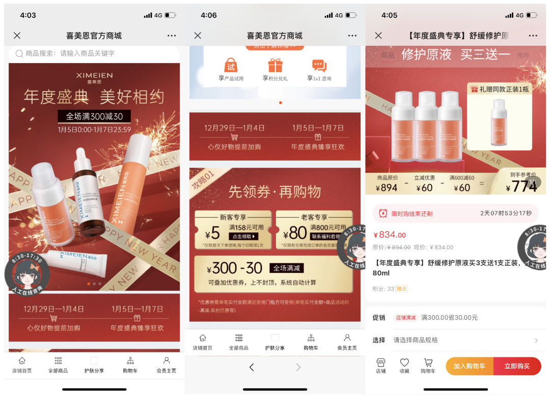 喜美恩適逢年末上新年貨節(jié)大促營(yíng)銷(xiāo)活動(dòng),商城內(nèi)會(huì)上線(xiàn)特惠福利給到消費(fèi)者,如“滿(mǎn)減”、“買(mǎi)贈(zèng)”等營(yíng)銷(xiāo)活動(dòng)。