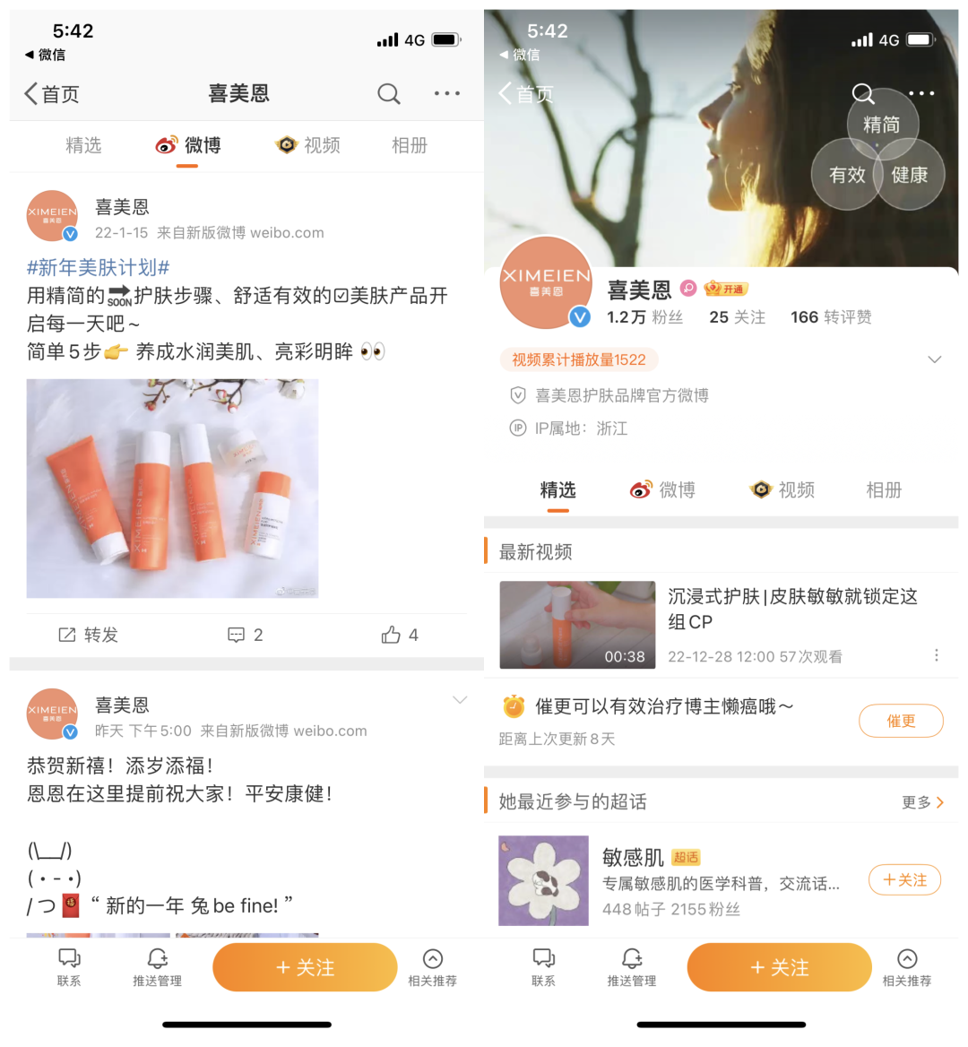 喜美恩的微博內(nèi)容主要分發(fā)視頻+短圖文,內(nèi)容以護(hù)膚知識(shí)+產(chǎn)品介紹為主,作為日常維護(hù)的一個(gè)平臺(tái)。