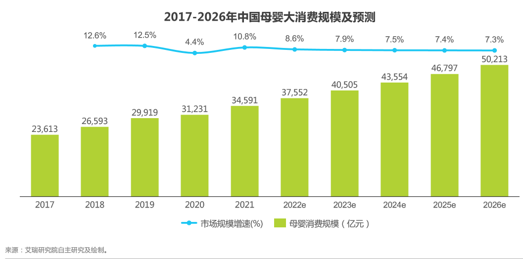 自2017年起中國母嬰消費規模持續上升且增速保持在10%以上,受疫情影響2020年消費規模增速下滑至4.4%,但隨著防疫工作的積極推進,2021年起中國母嬰大消費市場規模逐漸回暖。此外雖然受制于中國新生人口持續減少,中國母嬰大消費規模未來將可預見性的呈現較低的增速,但隨著人均收入不斷提升,母嬰消費者購買能力提升,以及得益于精細化養娃觀念母嬰產品消費需求不斷升級,都將持續推動母嬰大消費行業規模的增長,實現行業穩定發展。