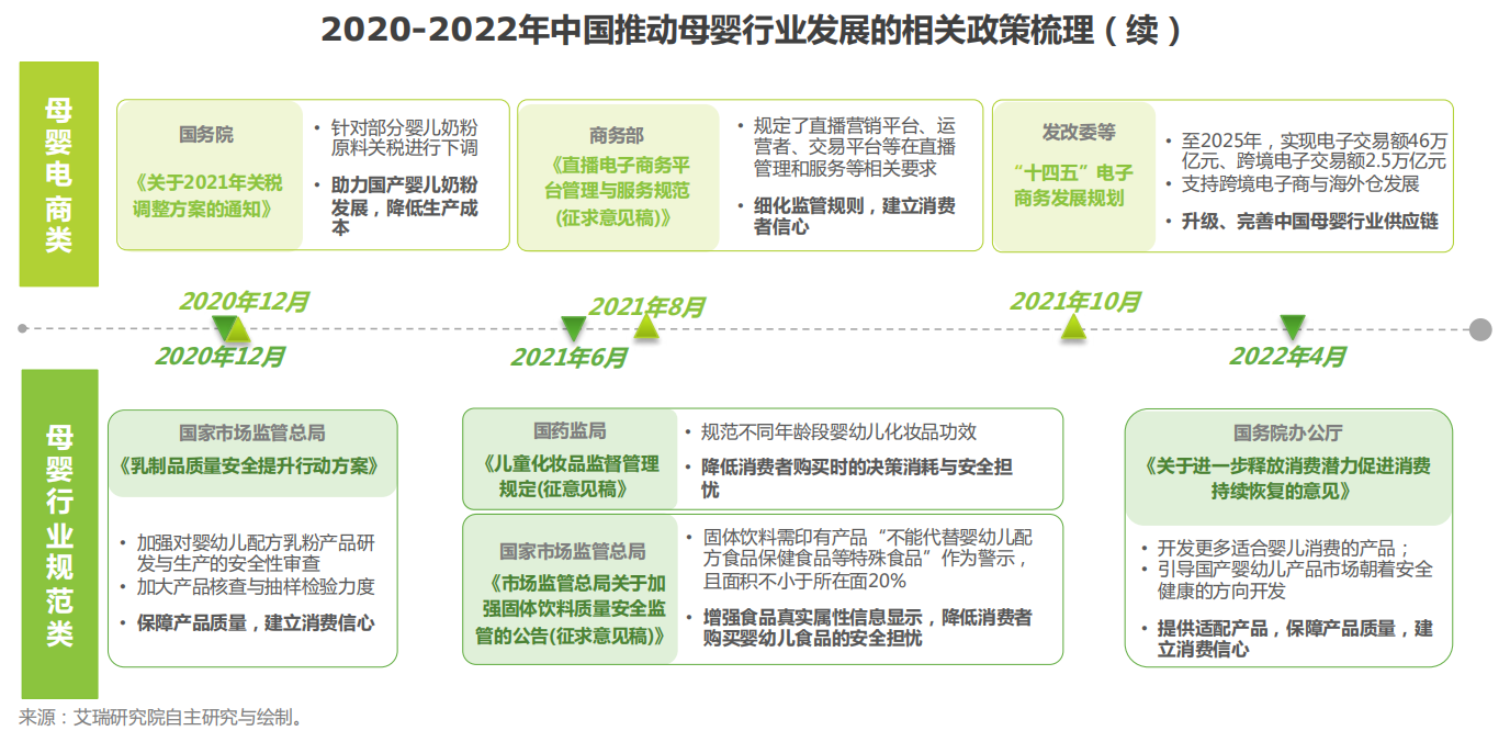 政策多向推動母嬰行業發展。就母嬰消費線上部分,政策鼓勵母嬰企業積極參與電商交易,就行業規范方面,政策就各主要母嬰大消費產品品類提出更嚴格的產品安全要求,并積極推動適配母嬰消費產品研發與生產,增加消費者產品選擇的同時,降低消費者由于產品安全等憂慮產生的購買決策消耗,提高消費信心。