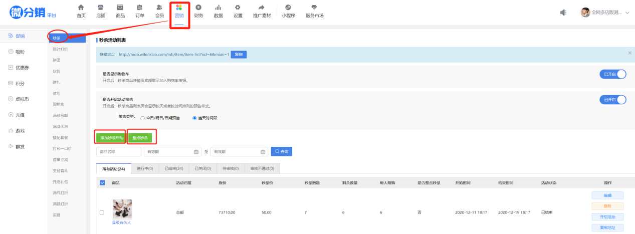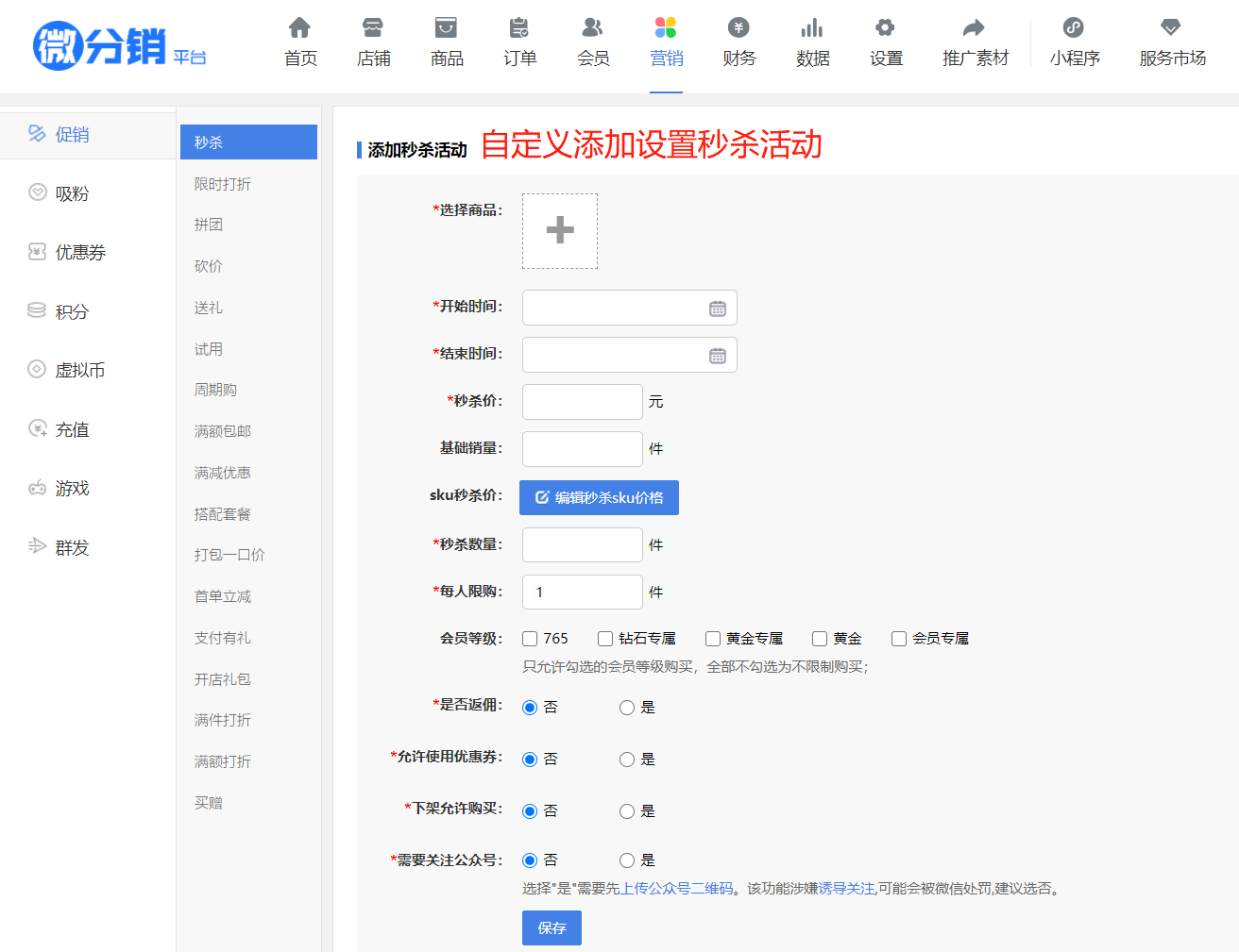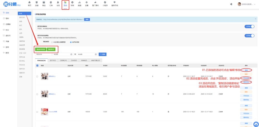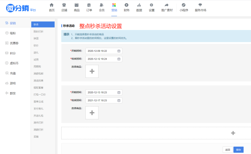 1、如何在啟博微分銷商家管理后臺創建一場“限時秒殺”活動: