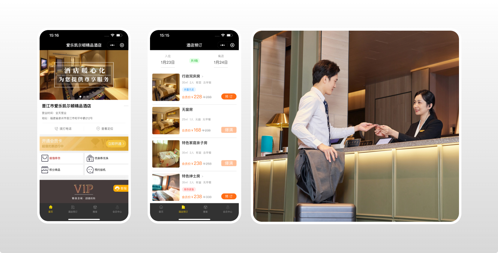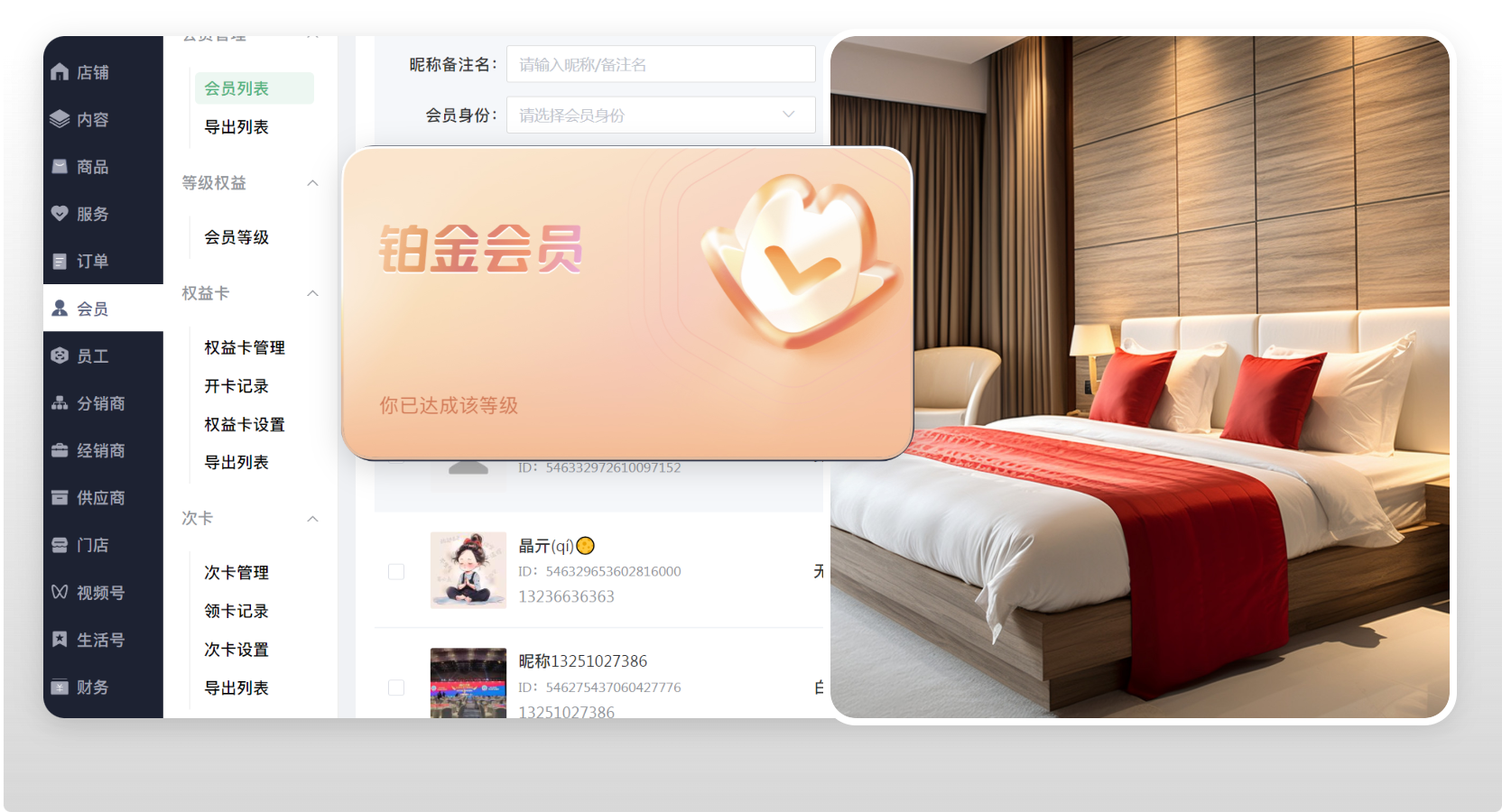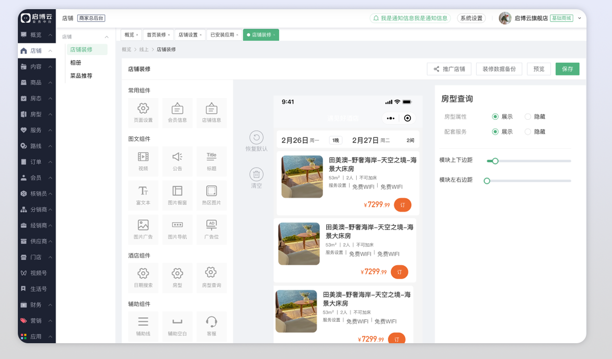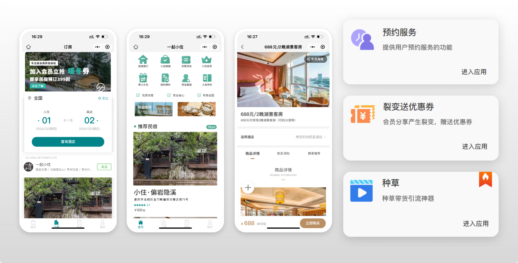 民宿酒店版通過微信公眾號、小程序雙渠道經營,實現客房預定,到店核銷,會員權益卡等功能;民宿版滿足多門店管理,實現民宿+商城+旅游線路等多業態經營的業務需求。