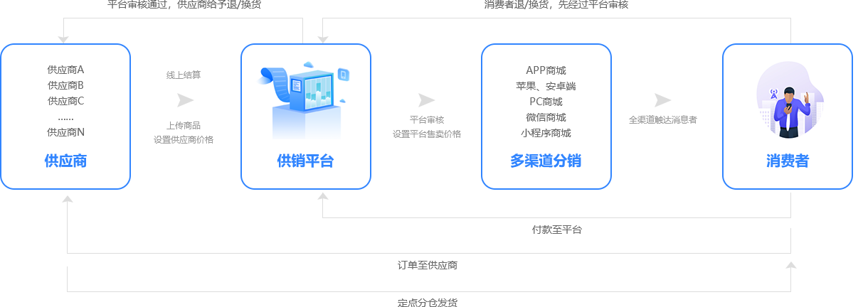 上游多用戶直接供貨銷售,下游多渠道觸達(dá)消費(fèi)者,幫您打造小京東、小天貓模式