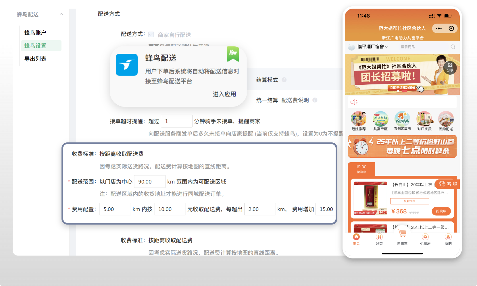 用戶通過小程序商城下單,系統將自動推送配送信息至蜂鳥配送平臺進行服務配送,滿足消費者日常生活購物需求,提供更完善更便捷的購物體驗。